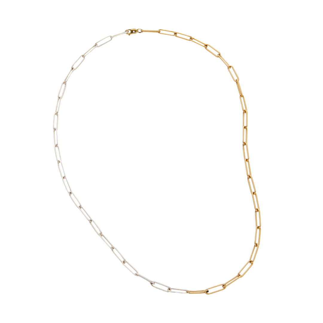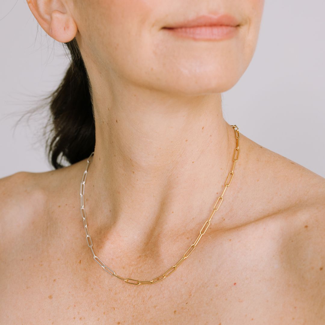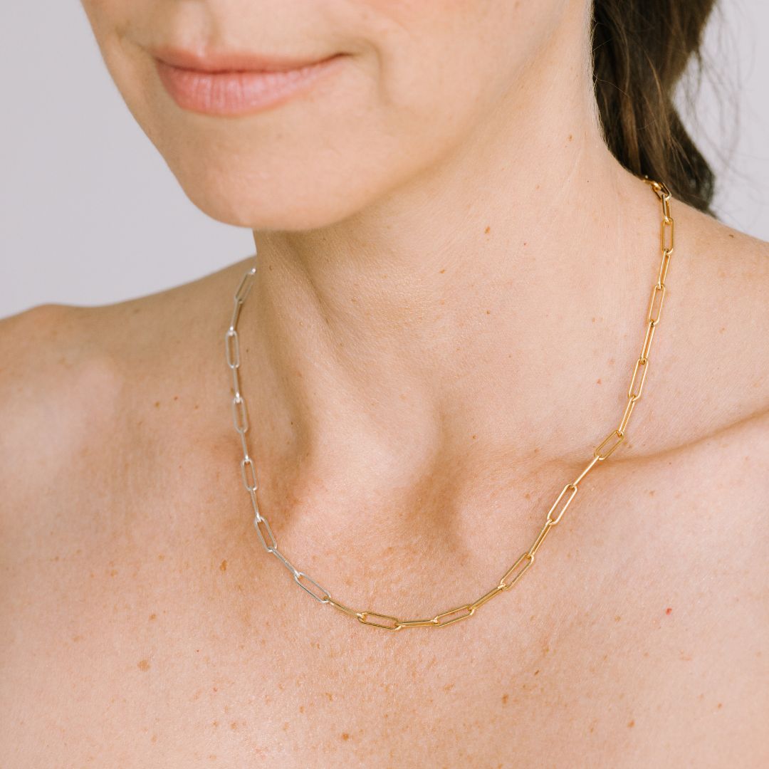 This bold yet classic paperclip chain blends sterling silver and 14k gold-filled links into one effortlessly cool necklace. Whether you're team silver, team gold, or wildly noncommittal, the Alanita Mix has you (and your neckline) covered.