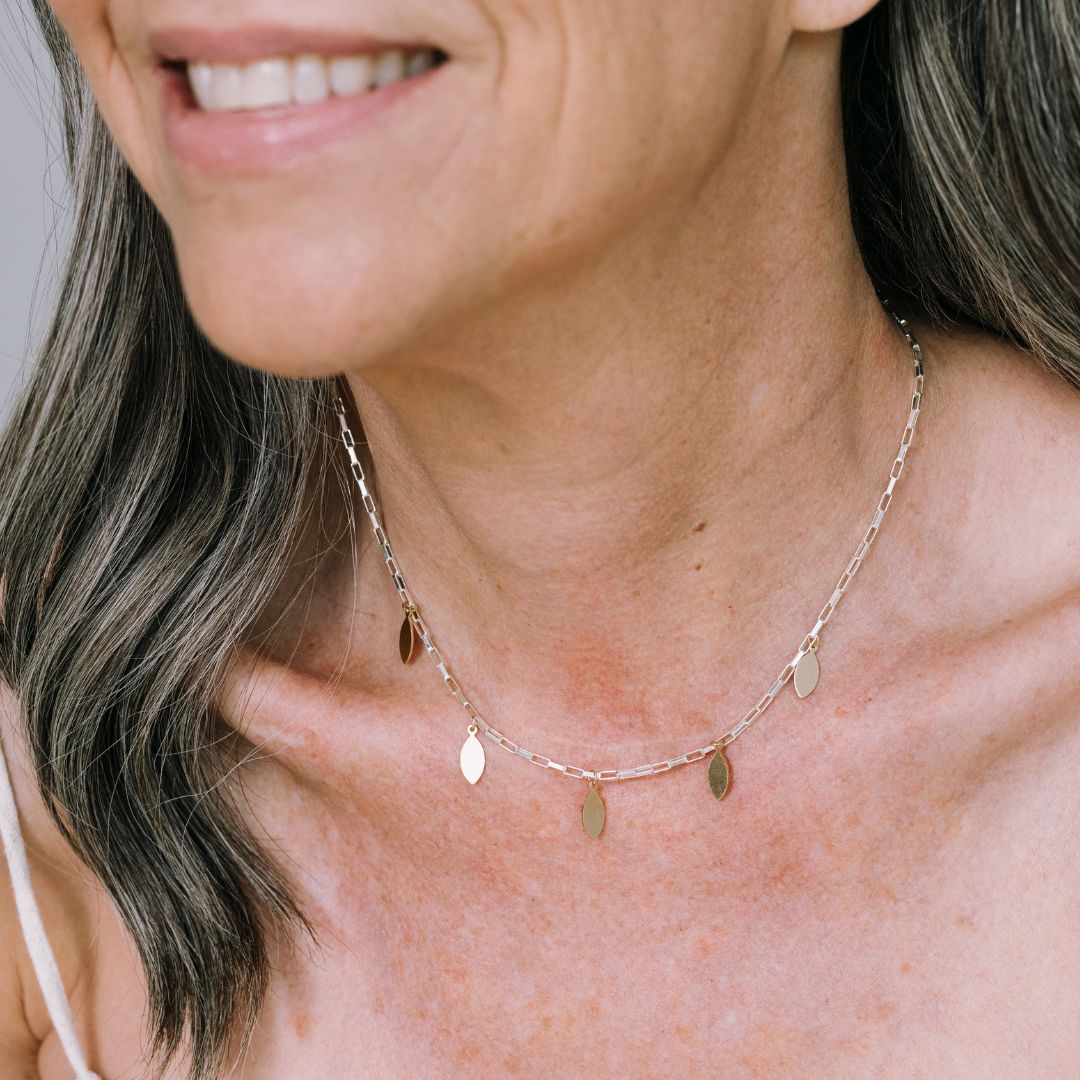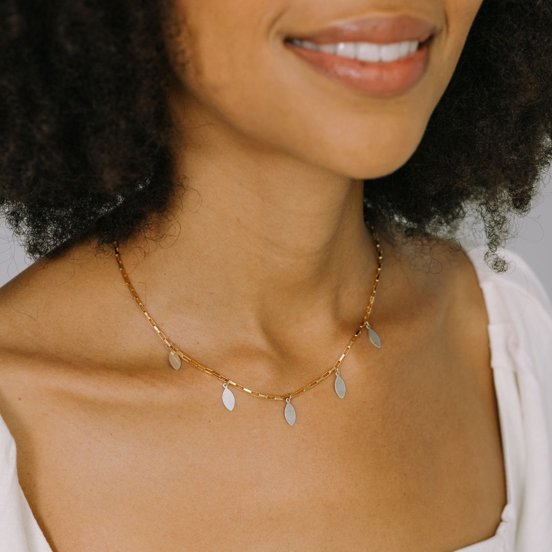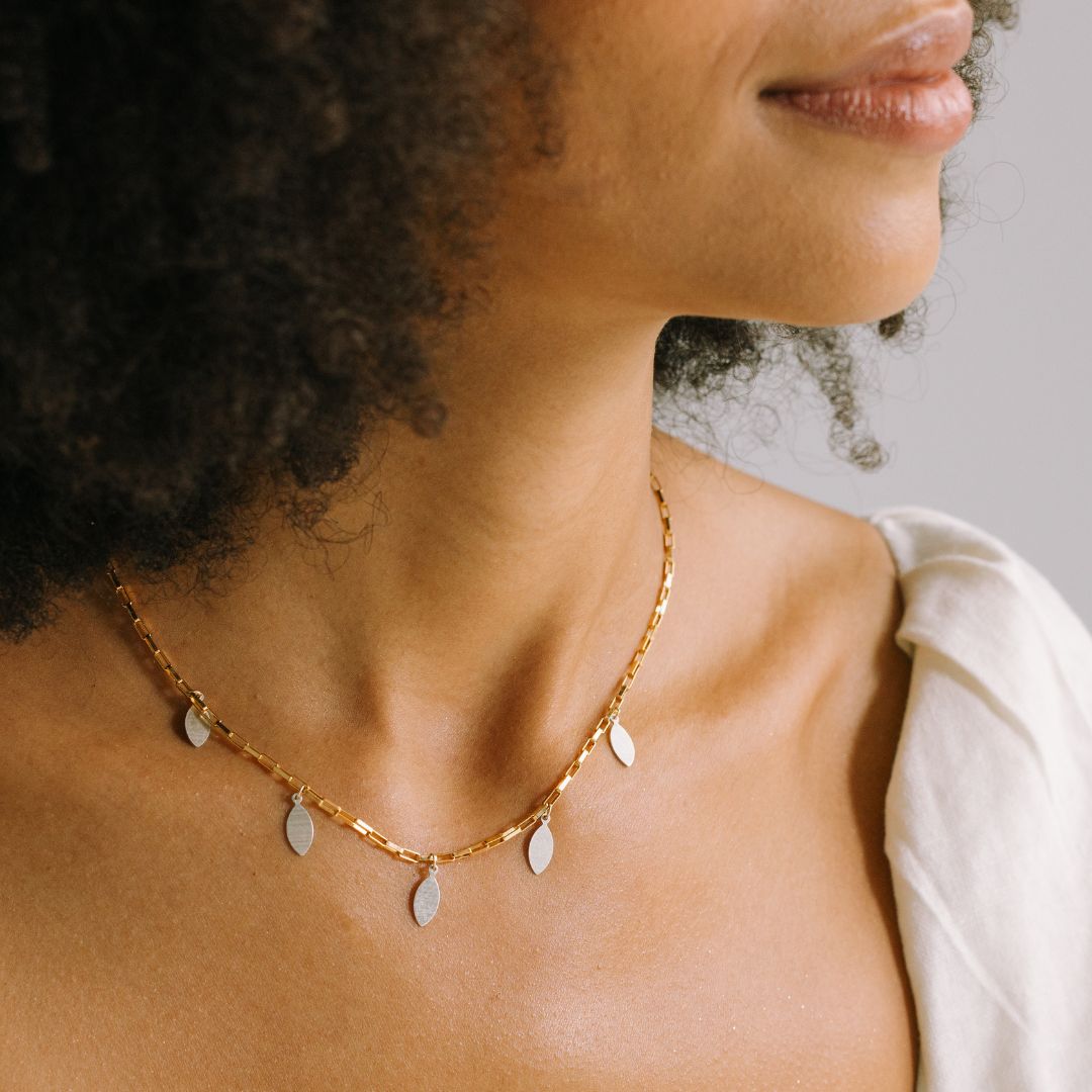 This piece features a classic box chain, available in 14k gold-filled or sterling silver, with five striking mixed metal marquis charms that sway with every move. It’s dramatic in the best way, quietly fierce, and built to be seen.