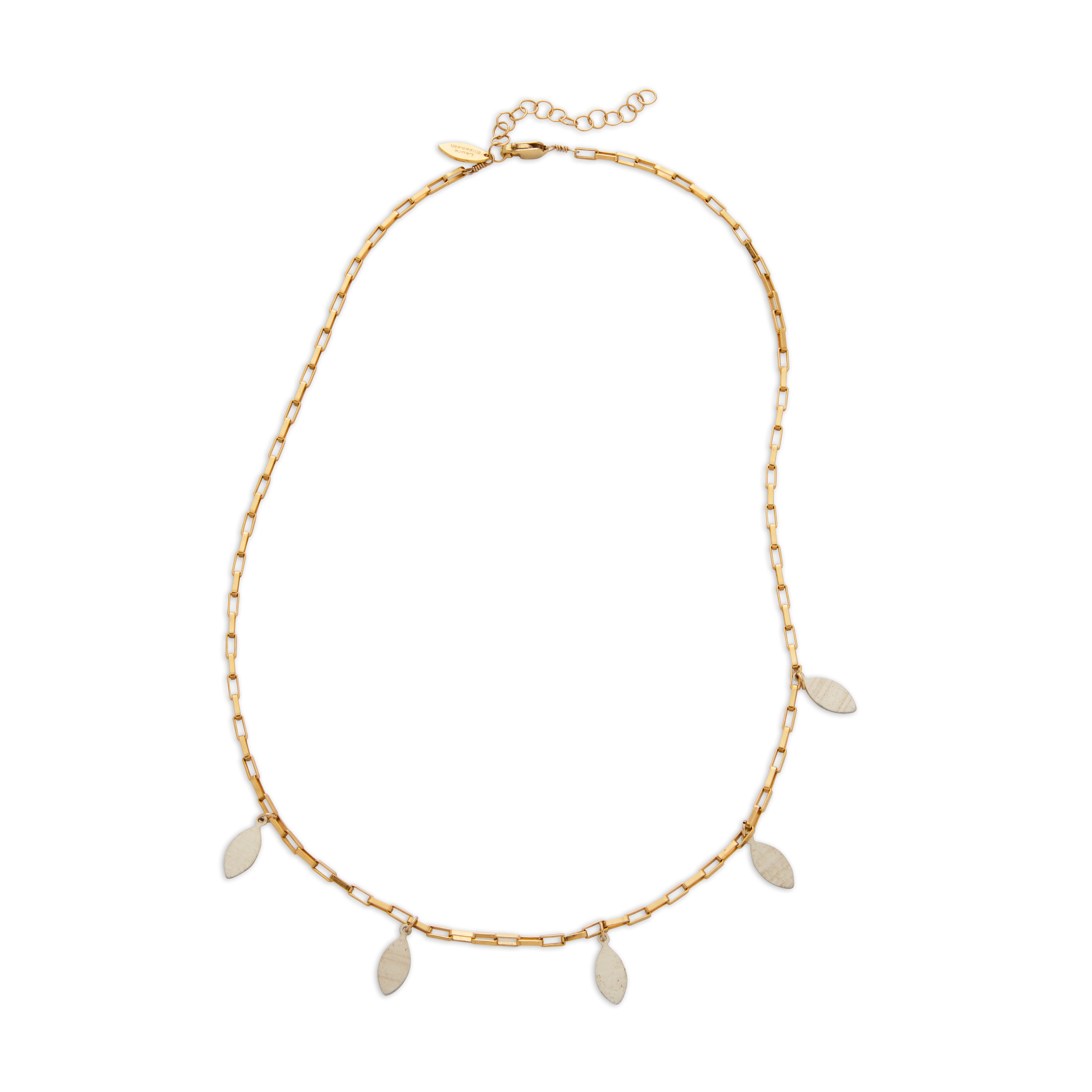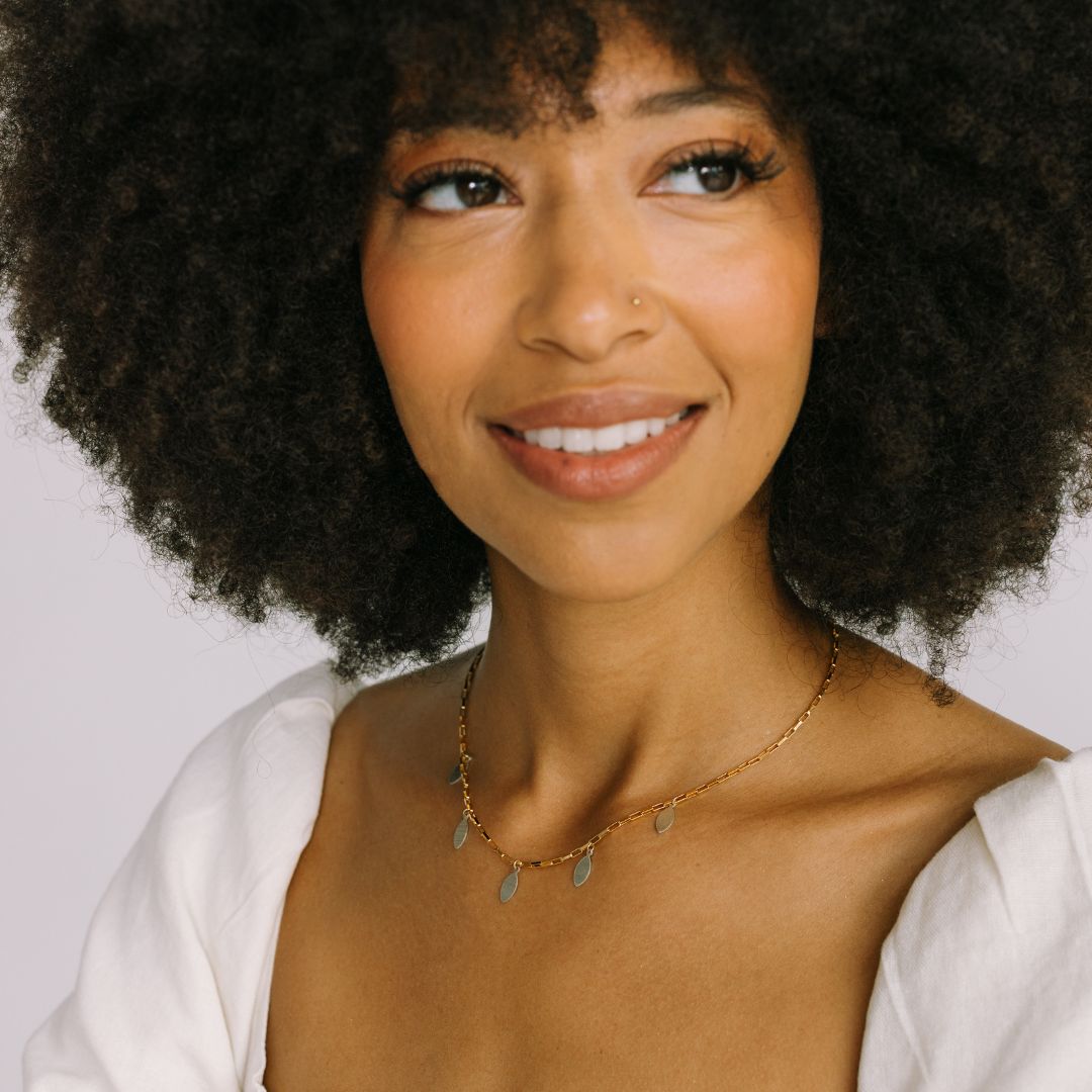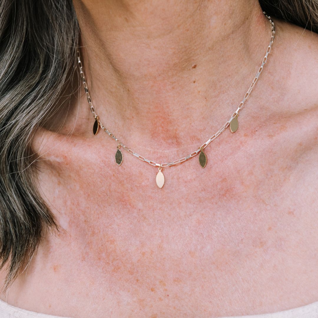 This piece features a classic box chain, available in 14k gold-filled or sterling silver, with five striking mixed metal marquis charms that sway with every move. It’s dramatic in the best way, quietly fierce, and built to be seen.
