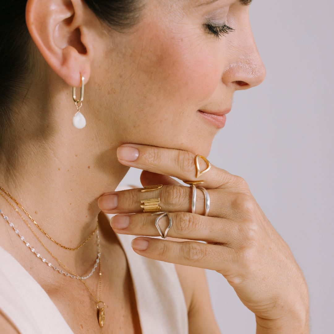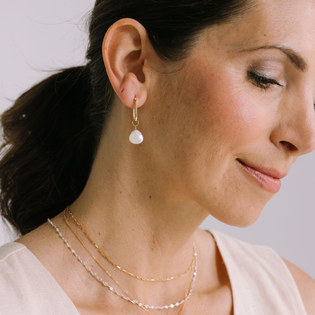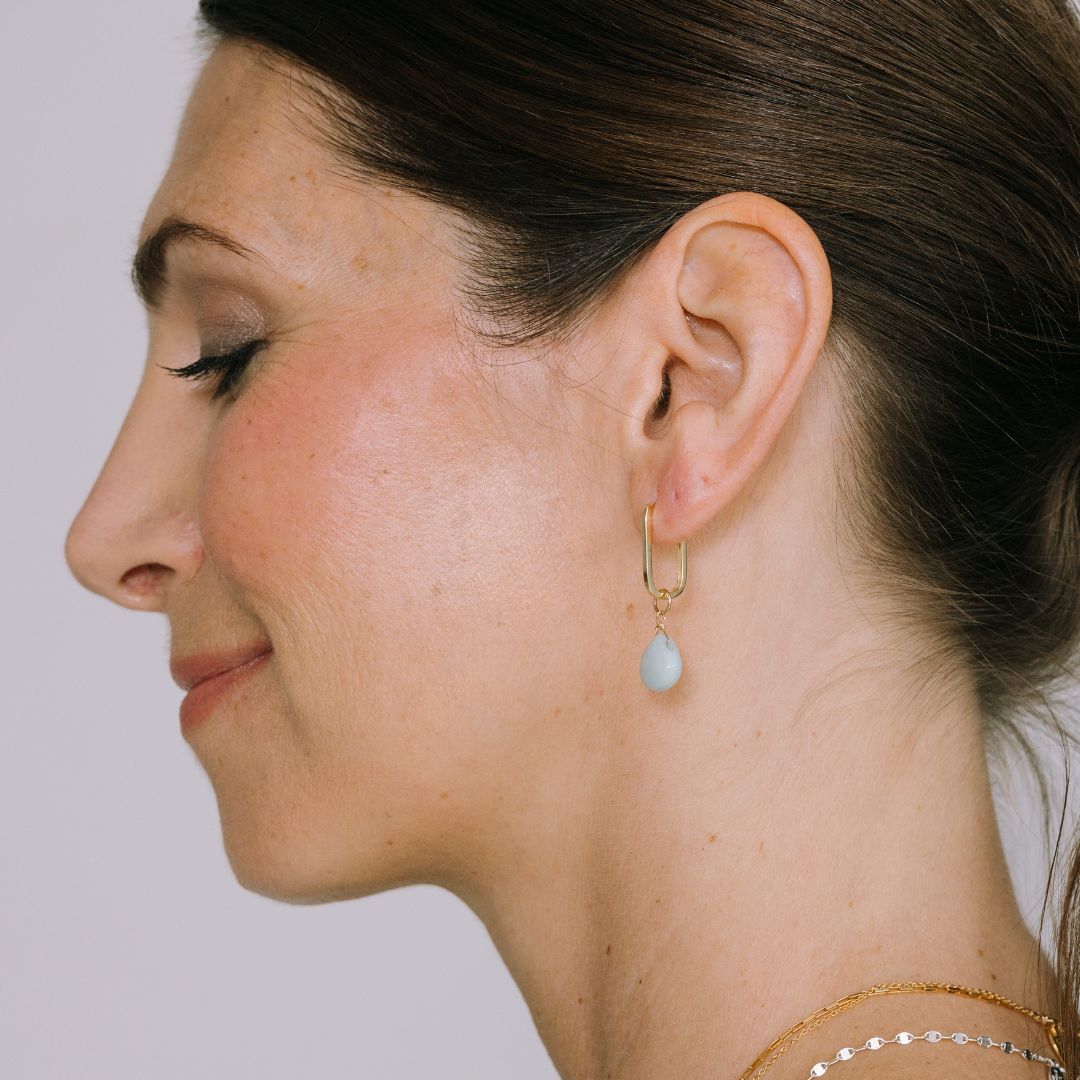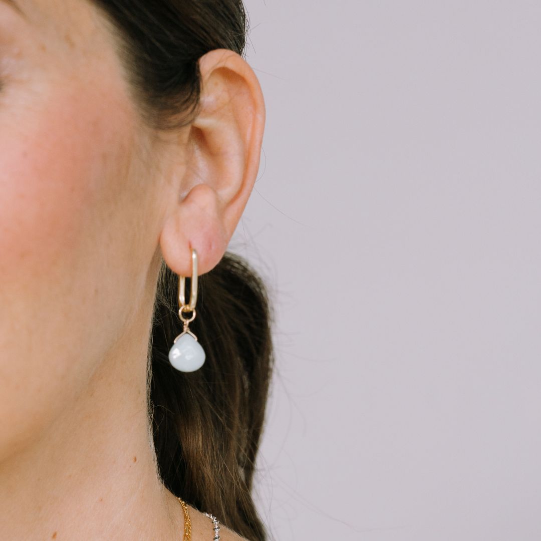 The Debbie Earrings feature sleek rectangle sleeper hoops in your choice of gold vermeil or sterling silver. Wear them solo for that punk-meets-polished vibe, or add interchangeable stone charms to shake things up. The stones are sold separately, so you can switch your look depending on the mood, the outfit, or the playlist.