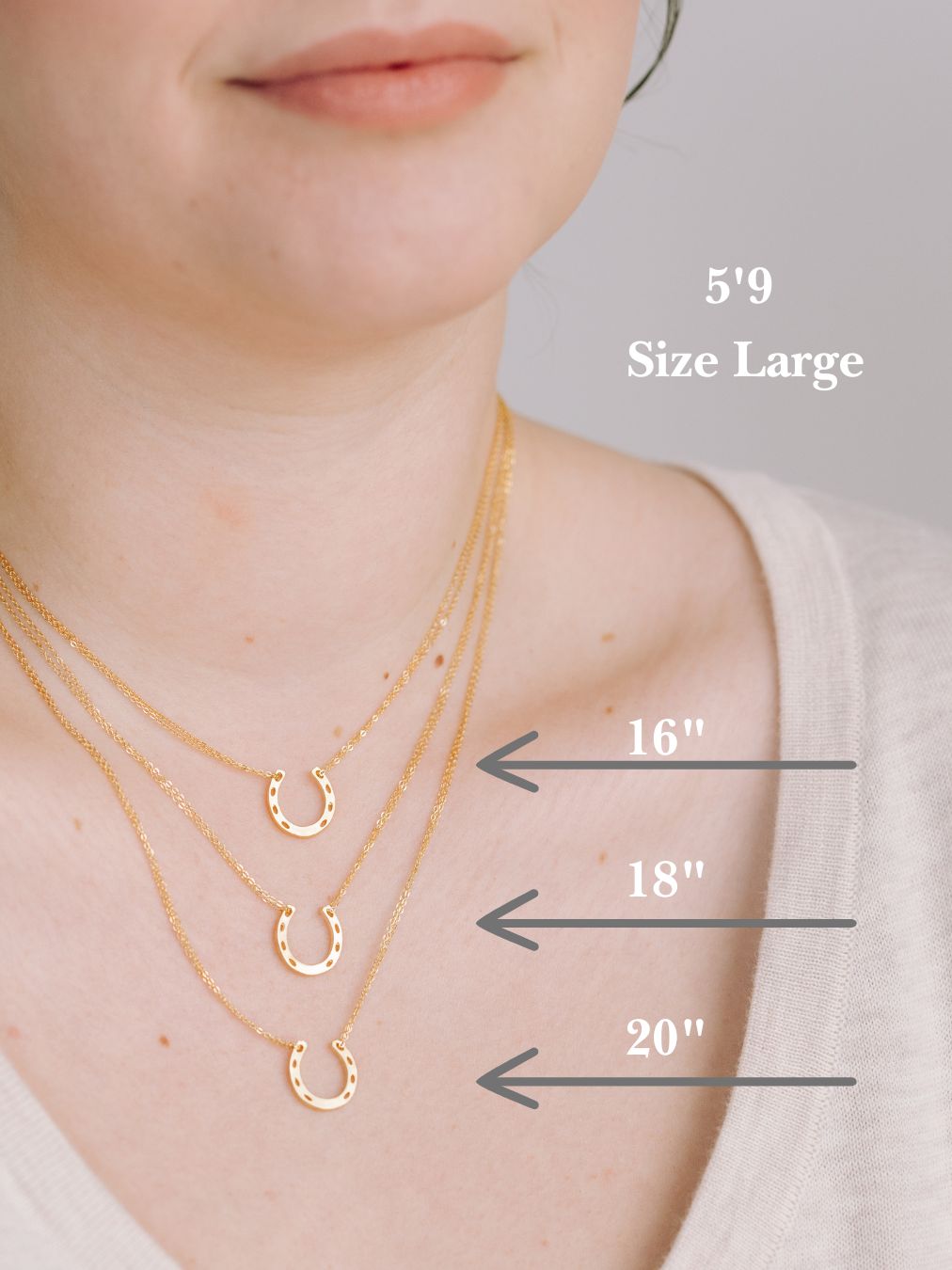 I RECOMMEND the 14" - all photos on models are 14" necklace (the shorter of the two chains is 14" and the longer/ball chain is 16") Tarnish resistant & hypoallergenic necklace Everyday necklace you can swim, sweat, and shower in Necklace is approximately 14...